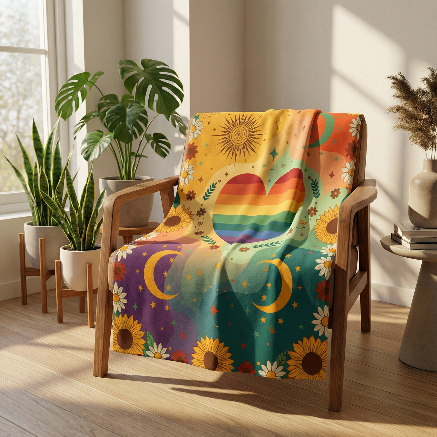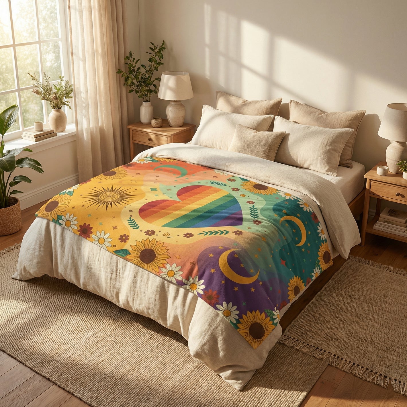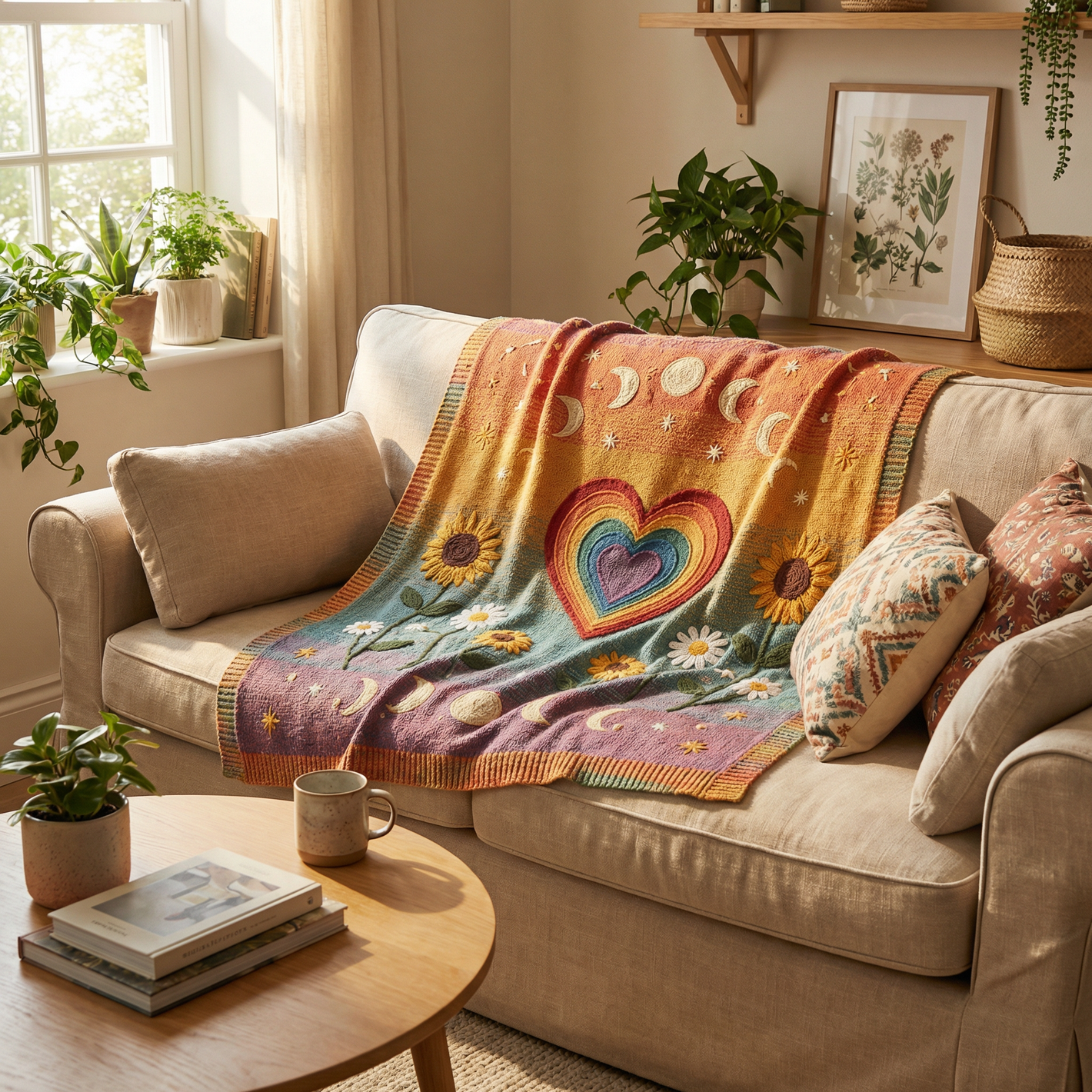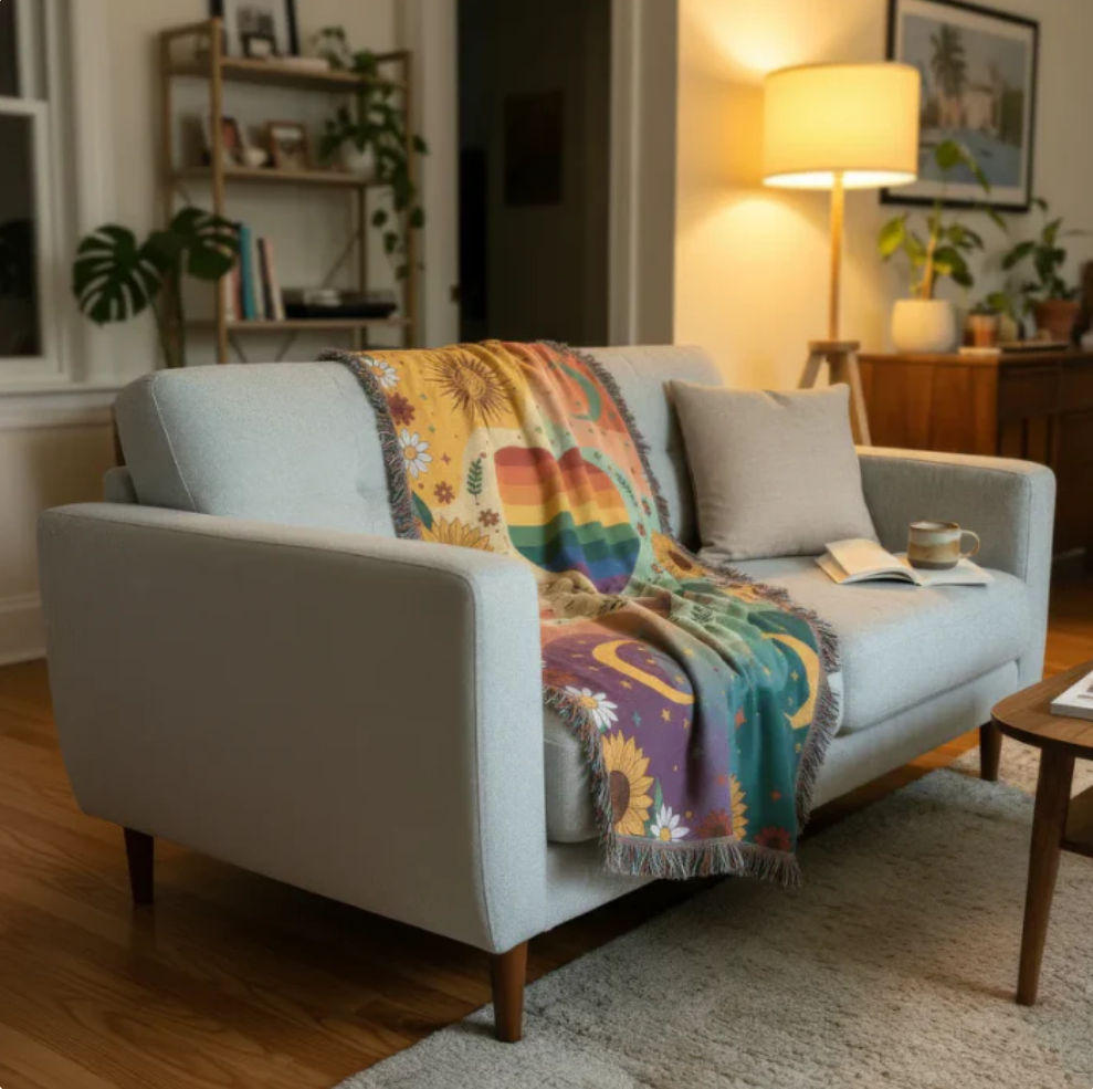 I make these blankets by hand and Iβm selling them. They are soft and colorful, with bright flowers, suns, and moons woven into the design. The rainbow heart in the center is my favorite part because it reminds me that everyone deserves warmth and kindness. I worked really hard on each one, and I hope when someone brings one home it can make their space feel cozy, bright, and full of good energy.